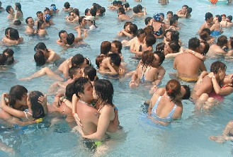 中新網(wǎng)7月30日電 臺北縣八里鄉(xiāng)八仙水上樂園4年前舉辦“愛的啵!逼呦η槿斯(jié)活動,吸引百余對情侶在水中忘情擁吻。今年8月7日“七夕”要挑戰(zhàn)更高難度,舉辦“水底接吻競賽”,第一名可獲得水中數(shù)碼相機1臺。