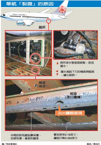 廢水箱接頭漏水疑是導(dǎo)致腐蝕源頭,但接頭到底是原始設(shè)計有問題,或施工不良,或華航保養(yǎng)維修時未發(fā)現(xiàn)漏水?臺飛行安全部門說都有待進一步了解。