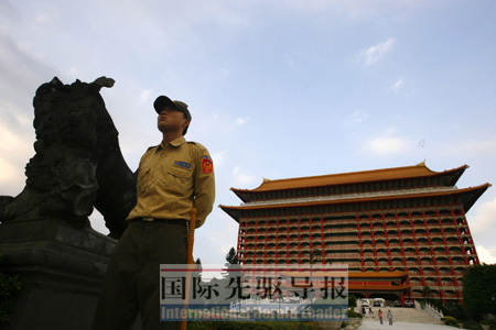 國際先驅(qū)導(dǎo)報特約撰稿沈宇哲發(fā)自上海 在臺北,有一座中國宮殿式建筑,它高達(dá)14層,隨處可見七彩畫梁、丹朱圓柱和琉璃金瓦。依傍基隆河、高聳于劍潭山之腰的它,正是海協(xié)會會長陳云林此次赴臺下榻的臺北圓山大飯店。