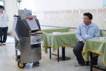 據(jù)臺灣媒體報道,這部點餐服務機器人,身高一百五十厘米,臺灣勤益科大電子系黃國興教授帶領四名同學以一年時間完成。機器人有臉部辨識系統(tǒng),有客人上門,就會主動打招呼,機器人會查看哪里有空位,規(guī)劃最佳路徑,帶領客人到達指定桌號,再透過觸控、聲控的方式進行點餐,并將點好的菜單利用無線網絡傳送到柜臺、廚房。