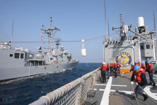 在海上整補(bǔ)科目時(shí),納編的班超軍艦?zāi)M回報(bào)機(jī)件故障,支隊(duì)下令由岳飛軍艦緊急支持料件,兩艘軍艦在等速并航中,實(shí)施高線傳遞演練。