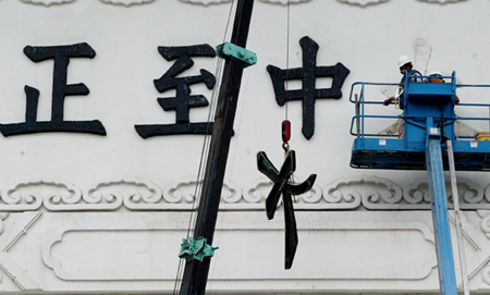 臺(tái)灣當(dāng)局拆除中正紀(jì)念堂“大中至正”牌樓內(nèi)外側(cè)共八個(gè)字,陳水扁甚至以太監(jiān)李蓮英來(lái)比喻:“被割掉了,還能裝回去嗎?”圖為“大”字被拆下時(shí)的情況。記者游順然/攝影