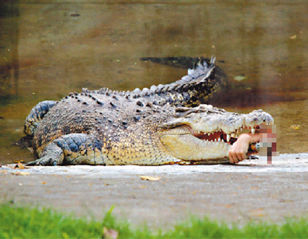 壽山動(dòng)物園4月傳鱷魚咬人意外,動(dòng)物園組長張博宇為鱷魚治病遭咬斷左前臂。搶回?cái)啾酆蠼雍虾螅瑥埐┯畛掷m(xù)復(fù)健中,至于闖禍的鱷魚正在冬眠。記者劉學(xué)圣/攝影