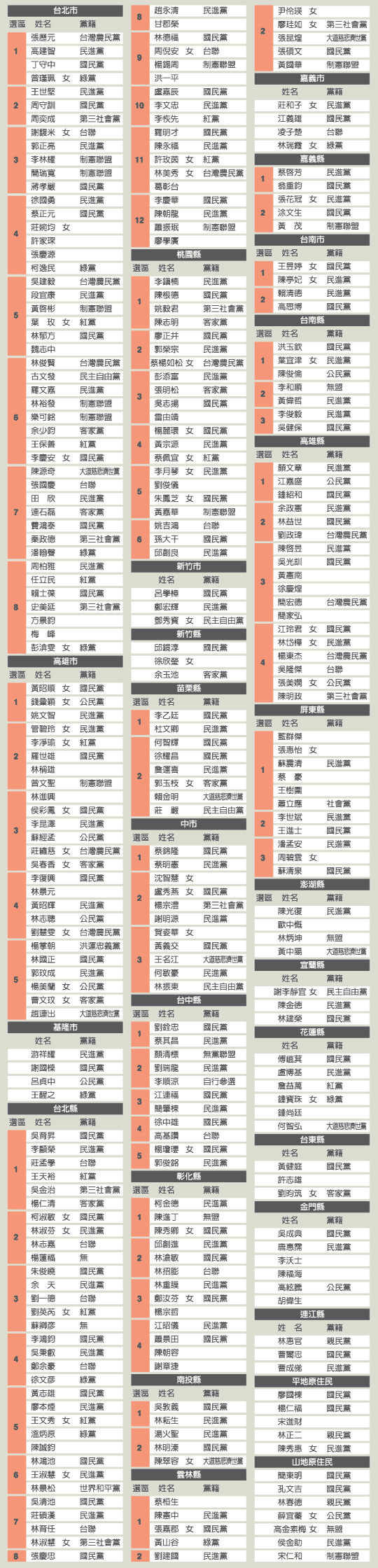 臺灣第七屆“立委”選舉區(qū)域候選人登記名單