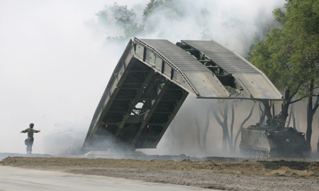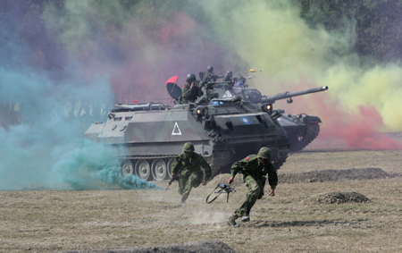 中新網(wǎng)1月24日電 臺灣軍方昨天在高雄舉行裝甲車操演,模擬對手滲透導彈基地的反制演習,共出動兩百多名士兵及數(shù)十輛坦克,場面相當逼真。