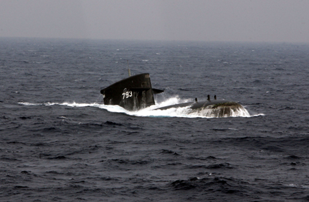 劍龍級潛艇沖出水面。