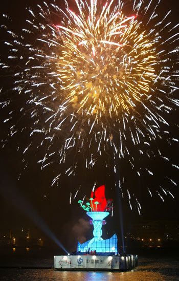 設(shè)在高港光榮碼頭海域的主燈,搭配煙花水舞,璀璨繽紛。(圖:臺(tái)灣《聯(lián)合報(bào)》)