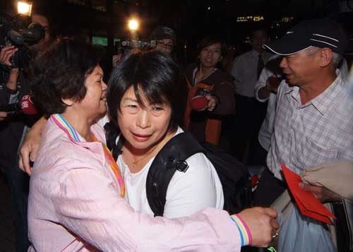 四川強(qiáng)震時,受困在都江堰纜車的臺灣旅客李淑(中)十五日返臺時,與親人相擁,但仍驚魂未定。右一為當(dāng)時同在纜車內(nèi)的丈夫。(“中央社”圖)