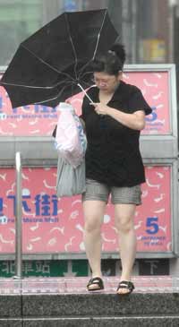“鳳凰”臺(tái)風(fēng)來襲,臺(tái)北市街頭不時(shí)出現(xiàn)強(qiáng)風(fēng)讓路過行人手中的雨傘直接開花。