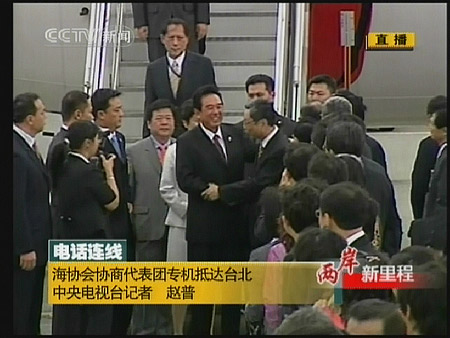 另據(jù)海基會副董事長兼秘書長高孔廉日前在記者會上介紹,十一月三日上午,陳云林等從北京機場出發(fā),中午抵達桃園機場,隨即轉(zhuǎn)往臺北圓山飯店下榻;下午,陳云林拜會;鶗岸麻L辜振甫夫人辜嚴倬云女士,兩會副會長進行相關協(xié)議預備性磋商;晚間,;鶗e行歡迎晚宴。