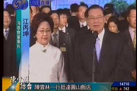 江丙坤也特別向陳會長提出來,這里有很多熱情的好客的臺灣的民眾,他們的心聲,相信他會聽得到。他并再度地表示歡迎,也希望這一次的協(xié)商順利成功。