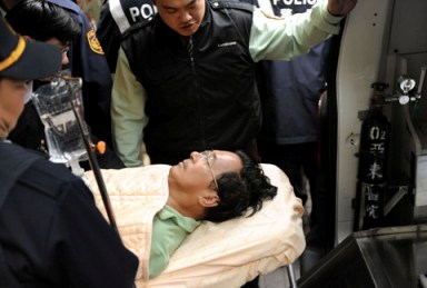 陳水扁躺在擔架上,頭發(fā)凌亂打著點滴。(“中央社”圖)