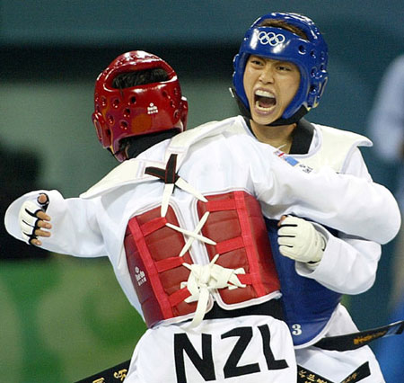 來自寶島臺(tái)灣的選手蘇麗文在跆拳道女子52公斤級(jí)復(fù)活賽中,帶傷出戰(zhàn)新西蘭選手。