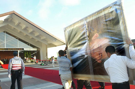 圖為工作人員在布置靈堂。