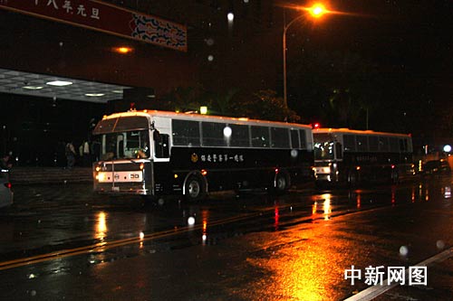 圖為3時30分,臺北地方法院的警備車載著陳水扁離開臺北地院,前往臺北看守所后。臺北地院恢復(fù)平靜。保安警察也收工 ,乘車離開。 (中新社記者 陳立宇/攝)