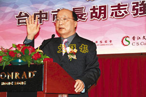 中新網(wǎng)12月19日電 臺(tái)中市長(zhǎng)胡志強(qiáng)18日在香港香江文化交流基金會(huì)午餐會(huì)發(fā)表演講,提出加強(qiáng)臺(tái)中、香港、廈門(mén)的經(jīng)濟(jì)文化交流,建設(shè)南峽(臺(tái)灣海峽南部)金三角經(jīng)濟(jì)區(qū)。