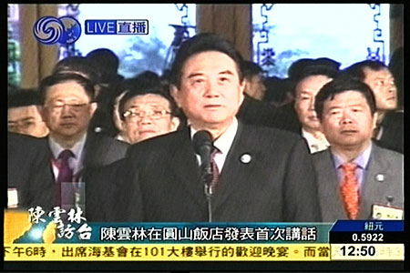 陳云林首先代表海協(xié)會(huì)協(xié)商代表團(tuán)的全體成員,向江丙坤及;鶗(huì)各位朋友以及在迎候他們的各位朋友、各位鄉(xiāng)親表示衷心感謝,同時(shí)也轉(zhuǎn)達(dá)了大陸十三億人民對(duì)海峽彼岸2300萬(wàn)骨肉同胞的真誠(chéng)祝福和真心感謝。