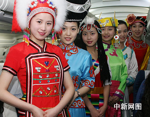 “民族之花”乘務(wù)組的姑娘身著漂亮的民族服裝提前亮相