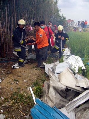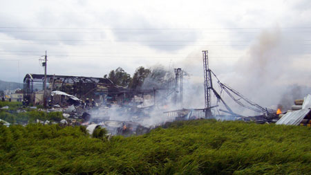 消防人員冒著大火到火場內(nèi)灌救,火場不斷傳出小型爆炸,十分嚇人,而現(xiàn)場馬路上都布滿工廠飛出的鐵皮與鋼架,連附近民家玻璃屋頂都震破得十分嚴(yán)重,滿目所見都是殘破現(xiàn)象,還有一位傷者震飛到三十多米的稻田草叢中,是被到場記者聽到哀嚎聲才通報(bào)搶救,現(xiàn)場慘不忍睹。