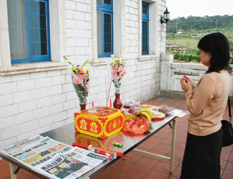 明天(4日)是清明節(jié),臺軍亡故官兵的遺族連日來紛紛到臺軍示范公墓掃墓,有人將刊有馬英九、蕭萬長在臺“大選”中獲勝消息的報紙供上,予以告慰。很多遺族表示,他們將在5月20日馬英九宣誓就任后,馬上向軍方申請“旌忠狀”。