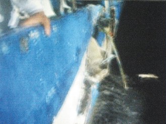 李慶華昨天還公布了由“聯(lián)合號(hào)”上一名釣客在事發(fā)前后所拍攝的一卷錄像帶,畫面中看出日艦“PL123”是在“聯(lián)合號(hào)”右側(cè)后方平行航行,隨后卻從右側(cè)擦撞,海釣船船身中央立即出現(xiàn)一個(gè)大洞。何鴻義到機(jī)房查看,發(fā)現(xiàn)進(jìn)水狀況嚴(yán)重,下令全體釣客與船員放下救生筏棄船逃生,當(dāng)時(shí)日艦就在距離聯(lián)合號(hào)約數(shù)十米處以探照燈監(jiān)視。
