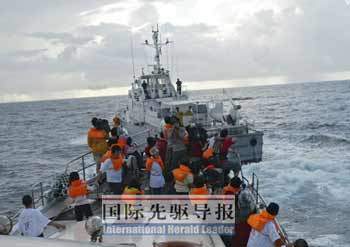 15日晚10點,臺灣市民代表黃錫麟等12名保釣人士穿著“日本人滾出釣魚臺”字樣的T恤,乘“全家!碧柡a灤诒娙藲g呼聲中出發(fā),前往釣魚島海域。與以往“保釣”行動不同的是,緊隨“全家!碧柕倪有臺灣海巡署的9艘海巡艦艇。