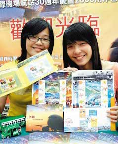 桃園郵局為了迎接兩岸包機(jī)直航,加上桃園國際機(jī)場航空站30周年慶,明天起將推出限量5000套直航個人化郵票,每套售價新臺幣300元,為了配合不同的主題,因此明天所蓋紀(jì)念郵戳為“桃園國際機(jī)場航空站30周年”,7月4日當(dāng)天所蓋紀(jì)念郵戳則是“2008兩岸周末客運(yùn)包機(jī)首航志慶”。
