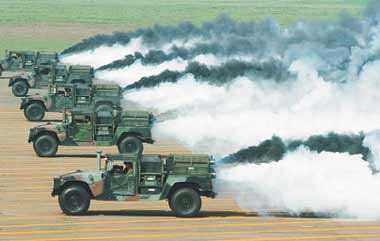 受臺風(fēng)影響,基于安全考慮,空降部隊無法實施空降作戰(zhàn),改采地面假想敵誘導(dǎo)實施,模擬反空降演練,圖為渦輪發(fā)煙車實施煙幕屏障。