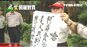 據(jù)臺灣TVBS報道,顧不得被大批警力包圍,有話要說的老伯伯努力甩開束縛,掙扎中,趁機秀出抗議陳水扁的海報。抗議老伯伯:“你看看應該判死刑!對不對!”