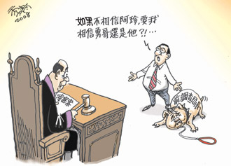 上星期葉盛茂隱匿公文案開庭,陳水扁出庭作證,兩人法庭的互動,又給季青畫“忠狗”的靈感。“葉盛茂對陳水扁卑躬屈膝,陳水扁卻對他不假辭色,還說寧愿相信吳淑珍也不相信‘調查局’,第二張忠狗畫面就浮現(xiàn)在腦海!”