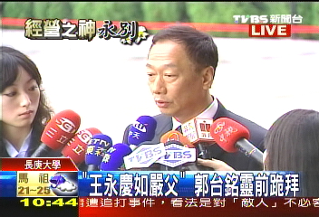 據(jù)臺灣TVBS報道,郭臺銘說:“他是除我父親以外第一個跪拜的人,因為我覺得他的精神,他對我的照顧,他給我的啟發(fā),他不但是臺灣工業(yè)之父,在我心目中,就像一個嚴(yán)父、慈父一樣,所以我覺得我不能表達(dá)什么,但是我一點點小小的心意,能夠讓我對他有所的追思,有所的惋惜!