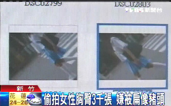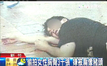 坐在警局里的林姓嫌犯,臉上包著一大塊紗布,警方說他臉腫到像豬頭,因為他涉嫌在新竹市場里,拿手機(jī)偷拍女性胸部和臀部,今天再度犯案的時候,當(dāng)場被市場攤販逮個正著,整個人被打到癱在地上,左眼縫了2針,臉腫得連家人都認(rèn)不出來。