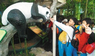 民眾抵達(dá)熊貓館后,依序由室外展示場(chǎng)進(jìn)入。動(dòng)物園表示,若天氣良好,就可在室外展示場(chǎng)的模擬棲地風(fēng)景的攀爬架、樹洞、平臺(tái)上看見團(tuán)團(tuán)、圓圓的身影。進(jìn)入熊貓館后,民眾先觀看各種大熊貓的保育資料,接著便進(jìn)入室內(nèi)展示區(qū),隔著4公分厚,經(jīng)防霧處理的玻璃與大熊貓對(duì)望。區(qū)內(nèi)也設(shè)有大型的樹干,供大熊貓休憩、攀爬。小朋友們參觀展示區(qū)內(nèi)的大熊貓模型,已讓參觀小朋友非常興奮,直喊“要是真的多好!