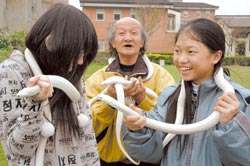 13歲的初中女生小玲,大膽地把白蛇放在脖子,還耀武揚威對媽媽說:“你看,我很勇敢吧!”8歲的小二生小武抓著蛇頭到處嚇人。17歲高中生小芳,把白蛇當圍巾套在脖子取暖。