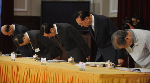 隨后,他帶領(lǐng)在場的蕭萬長、“行政院副院長”邱正雄、“國防部長”陳肇敏、“交通部長”毛治國等人起立,深深鞠躬道歉,足足有7秒鐘之久。