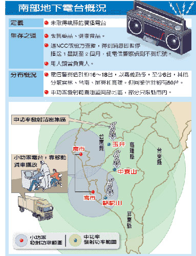 “南部地下電臺(tái)最多時(shí)有八、九十臺(tái),現(xiàn)在少了,大概不到二十臺(tái)!焙榻ㄈ收f(shuō),南部地下電臺(tái)多分散在云林、嘉義、臺(tái)南、高雄、屏東山區(qū)。但電臺(tái)業(yè)者指出,單高雄地區(qū)至少還有五十家。