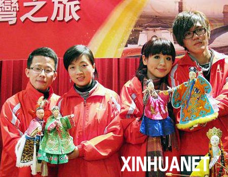 1月14日,兩岸新人在體驗臺灣布袋戲時合影留念。來自大陸的26對新人搭乘兩岸直航班機來到臺灣,將參加于1月15日在日月潭舉行的“日月同喜,喜傳天下”集體婚禮并游覽臺灣名勝古跡,感受當(dāng)?shù)仫L(fēng)土人情。新華社圖