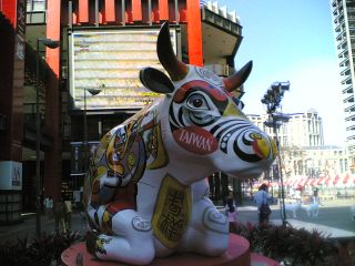 今年生肖牛年,搭配牛年,臺(tái)北市文化局協(xié)辦的“2009臺(tái)北奔牛節(jié)、奔牛入市、放養(yǎng) ”活動(dòng).由兩只牛拼奏成一頭奔跑的牛藝術(shù),另外全世界最大的牛,長(zhǎng)、高四米六、兩米五,則現(xiàn)身在信義商圈,藝術(shù)家創(chuàng)作的主軸為平安牛,上頭畫(huà)滿(mǎn)臺(tái)灣傳統(tǒng)的民俗圖騰。國(guó)際文創(chuàng)執(zhí)行長(zhǎng)陳秉鴻表示,臺(tái)北市是全世界第六十五個(gè)城市舉辦奔牛節(jié)活動(dòng),為了凸顯臺(tái)灣文化,臺(tái)北奔牛節(jié)充滿(mǎn)亞洲創(chuàng)意元素。
