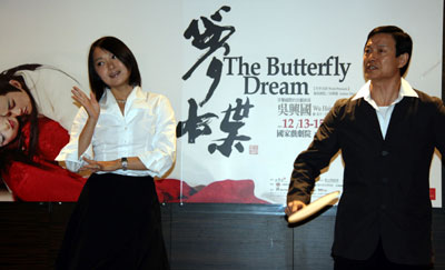 中新網(wǎng)11月2日電 據(jù)“中央社”報(bào)道,臺灣當(dāng)代傳奇劇場新創(chuàng)昆曲風(fēng)歌劇《夢蝶》十二月十三至十六日將在戲劇院演出。在昨天的記者會中,作為男女主角的京劇名角吳興國(右)與昆曲名伶錢熠(左)現(xiàn)場表演一段“搧墳女與莊周”。