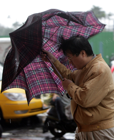 米塔臺(tái)風(fēng)二十六日下午已轉(zhuǎn)為輕度臺(tái)風(fēng),臺(tái)灣氣象部門預(yù)測(cè)米塔臺(tái)風(fēng)暴風(fēng)圈將會(huì)縮小,但外圍環(huán)流與鋒面共伴效應(yīng)為臺(tái)灣島北部及東部帶來的豪雨仍會(huì)持續(xù)。圖為行人在雨中艱難行進(jìn)!爸醒肷纭眻D 張皓安 攝