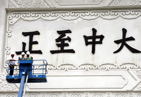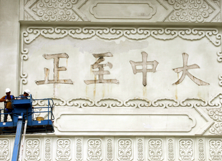 臺(tái)北中正紀(jì)念堂前面的“大中至正”牌匾拆卸工程七日下午進(jìn)行順利,拆下最后的“正”字,牌匾歲月痕跡明顯。圖為拆卸前后對(duì)比!爸醒肷纭眻D 郭日曉 攝