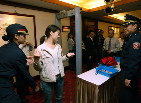 臺灣當(dāng)局“國安”單位近來加強(qiáng)安全工作。圖為陳水扁十三日出席公開活動時(shí),出席人員連外套都須脫下檢查!爸醒肷纭眻D 郭日曉 攝