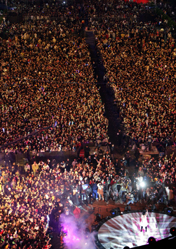 臺(tái)北市政府前廣場(chǎng)十二月三十一日舉辦“2008臺(tái)北最HIGH新年城”跨年晚會(huì),炫麗的舞臺(tái)燈光和精彩的藝人表演,吸引上萬的民眾一起前來參加跨年晚會(huì)。(“中央社”圖;張皓安攝)
