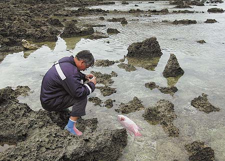 臺(tái)灣綠島暴斃的魚(yú)群原本只出現(xiàn)在燈塔到公館沿岸,六日連柚子湖一帶也出現(xiàn),到底是毒物擴(kuò)散還是單純地被沖刷到此,引來(lái)當(dāng)?shù)鼐用窀叨汝P(guān)切,拍照存證。臺(tái)灣《中國(guó)時(shí)報(bào)》圖