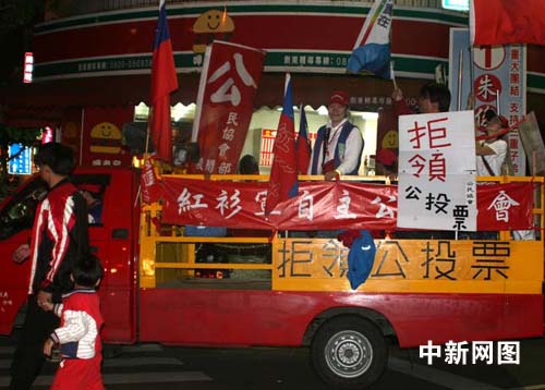 第七屆臺(tái)灣“立委”選舉12日舉行。圖為11日晚,紅衫軍在掃街催票時(shí)訴求拒領(lǐng)“公投”票。中新社記者 陳立宇 攝
