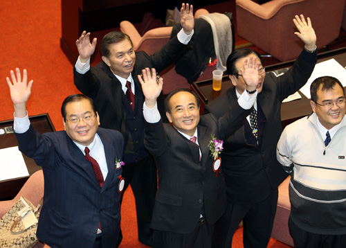 臺灣地區(qū)第七屆“立法院”二月一日選舉“立法院長”,中國國民黨籍“立委”王金平(前左二),以85票對27票打敗對手,確定連任“立法院長”,中國國民黨籍“立委”曾永權(quán)(前左一)則高票當(dāng)選“副院長”。(“中央社”圖;郭日曉攝)