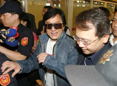 香港藝人成龍(中)十八日應(yīng)邀來臺(tái)出席公益活動(dòng),由于他曾經(jīng)批評(píng)過2004年臺(tái)灣“大選”,有十余人至機(jī)場抗議,成龍?jiān)诤骄退狡副H耸康谋Wo(hù)下通過入境大廳。(“中央社”圖)
