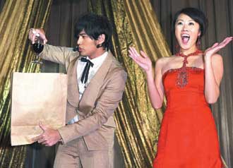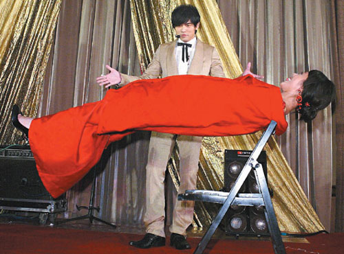 “南拳媽媽”團(tuán)長彈頭,昨天迎娶交往半年的女友洪端偋,晚間舉辦盛大豪華婚宴,介紹兩人認(rèn)識(shí)的周杰倫,婚禮上花心思帶來一段“超級(jí)魔術(shù)秀”,神奇地把新娘子漂浮空中。(臺(tái)灣《聯(lián)合報(bào)》圖)