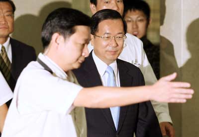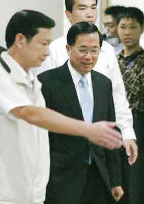 陳水扁今天上午9點20分驅(qū)車抵達臺北地院,一身筆挺西裝、藍色領帶、白色襯衫,臉上還露出略帶嚴肅的淺笑。沒有對媒體發(fā)表談話的他,似乎仍對今天的大對質(zhì)充滿信心。