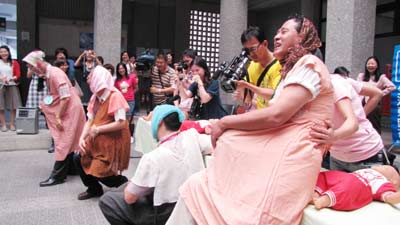 中新網(wǎng)3月4日電 據(jù)“中央社”報道,屏東縣4日舉辦婦女節(jié)系列活動中的“超級媽媽闖關(guān)”活動,縣長曹啟鴻(右)等扮孕婦,體驗媽媽的辛勞。